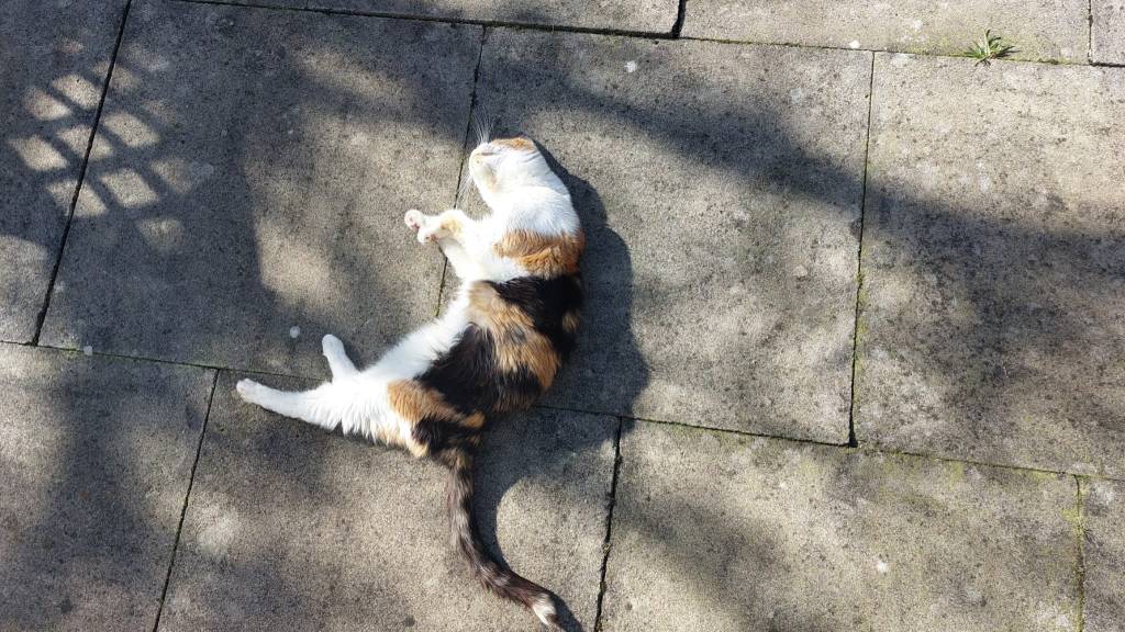 A usual indication of the change in season is our cat basking on the garden patio. She’ll only do this when the conditions are just right, and it seems that today the stone is at optimum temperature: