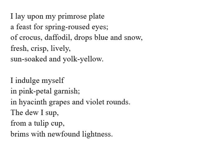 I have appreciated this year’s springward step towards warmth and brightness again (though ignoring the bouts of hail and snow only a couple weeks ago…). I only hope that it carries on and that we all have ample opportunity to absorb as much as possible.